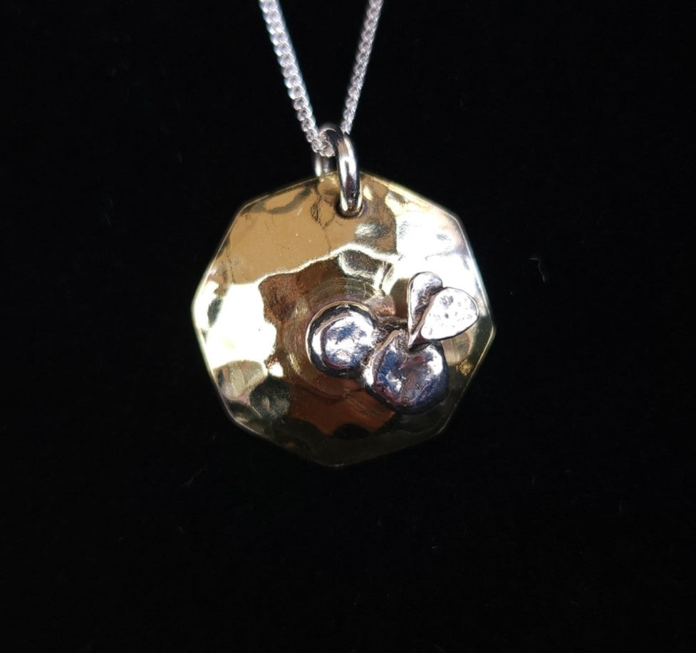 Recycled 925 Stirling silver Bumblebee, on a hand hammered hexagon of brass. Finished to a high polish on a Stirling silver chain